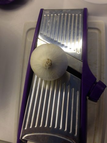Prendi una mandolina, meglio se regolabile, e dopo aver pulito le cipolle, affettale formando degli anelli.