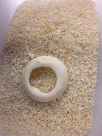 Adesso dividi gli anelli e prepara un piatto con un po’ di farina. Prima che gli anelli si asciughino, infarinali per bene e lasciali da parte.
