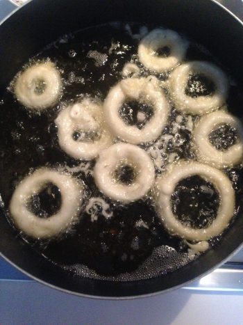 Immergi delicatamente gli anelli nell’olio caldo, evitando di sovraffollare la padella.