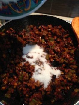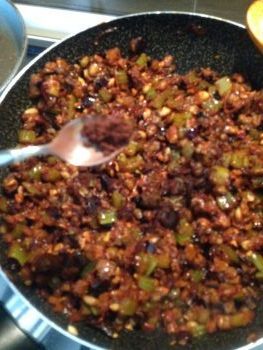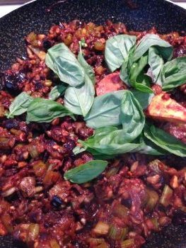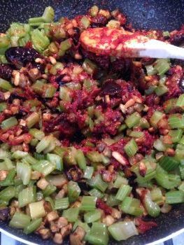 Inserisci le olive e il sedano nella padella con le cipolle, i pinoli, i capperi ecc…. e versa anche il concentrato di pomodoro. Lascia cuocere per circa 20 minuti.