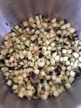 Lava le melanzane e tagliale a cubetti. Io ho usato la cubettatrice della Kenwood che mi ha reso questo passaggio molto semplice e veloce. L’unico incenveniente è che i cubetti sono piccolini ma, per la mia preparazione, andavano bene. Chiaramente se scegli di realizzare un taglio al coltello, accertati che le sezioni abbiano la stessa dimensione per rendere omogenea la cottura e realizza dei pezzi di circa 2 cm x 2 (ho detto circa 😜).