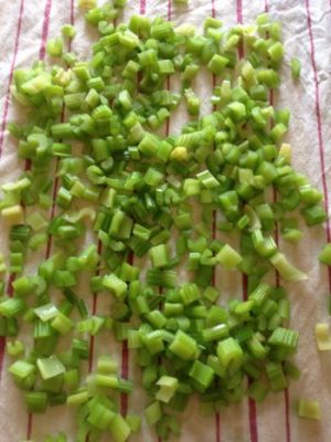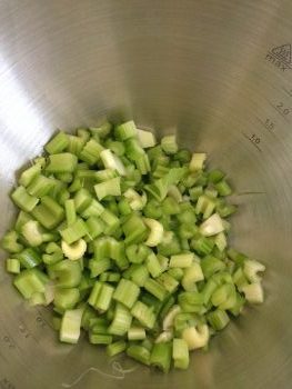 Lava i gambi di sedano, puliscili e tagliali in sezioni di circa 1 cm.