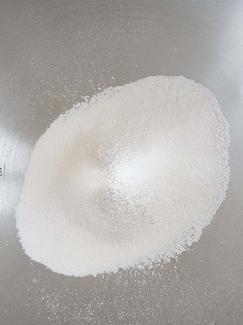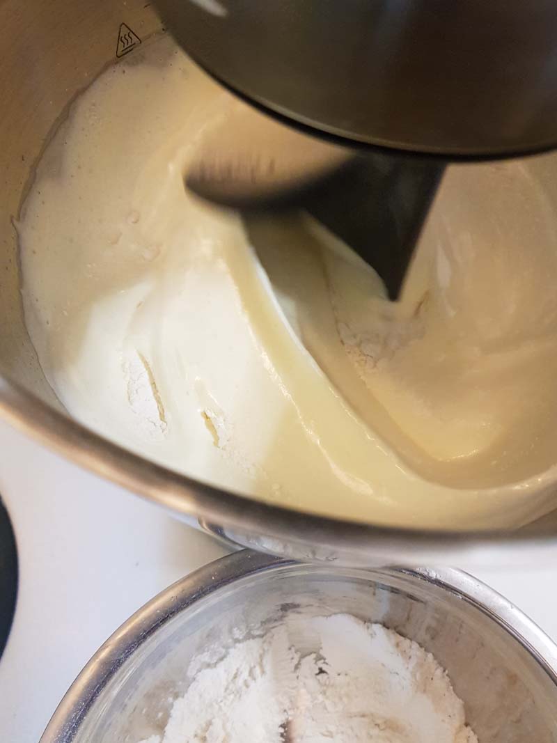 Inizia ad inglobare le polveri con la planetaria a velocità minima. Chiaramente puoi fare lo stesso con un cucciaio con movimenti lenti dal basso verso l’alto. In pratica non devi far smontare l’impasto.