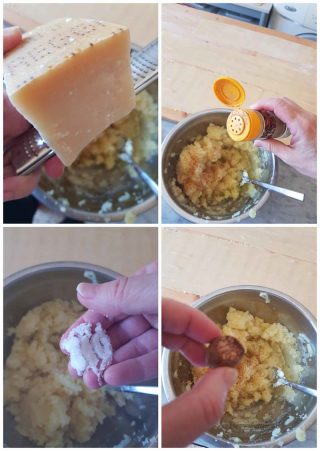 Condisci la farcia con sale, noce moscata, pepe, parmigiano e, aiutandoti con i rebbi della forchetta, rendi uniforme la purea.