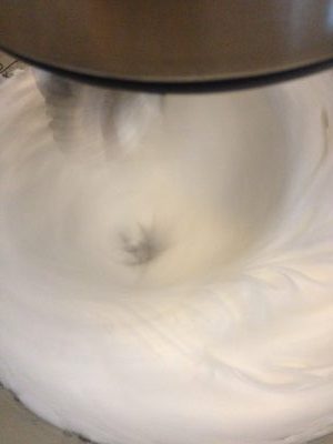 Dividi i tuorli dagli albumi ed inizia a lavorare proprio gli albumi. Prendi un tegamino e versa all’interno 25 g di acqua e 80 g di zucchero. Con un termometro da cucina, controlla la temperatura e, quando raggiungerà i 121°, inizia a versare questo sciroppo a filo nella planetaria con gli albumi. Io ho usato il Kenwood gourmet e, quest’operazione è stata davvero semplice.