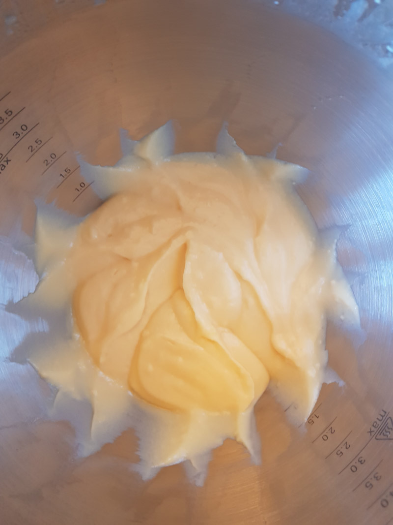 La glassa è quasi pronta. Prendi il mixer ad immersione e, dopo aver versato la glassa in un recipiente da frigo, lavorala con il mixer fino a quando la vedrai omogenea (poco più di un minuto).