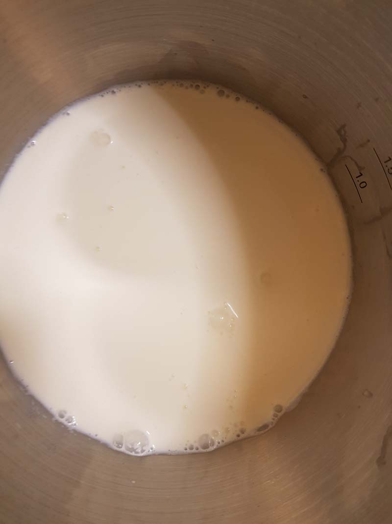 Per prima cosa occorre preparare la glassa a specchio. Considera che dovrà riposare almeno una notte in frigo prima di poterla utilizzare. Procurati un termometro da cucina. Versa in un tegame, o nella ciotola del robot, la panna, il latte e lo zucchero. Mescolando lentamente, raggiungi i 100° di temperatura.